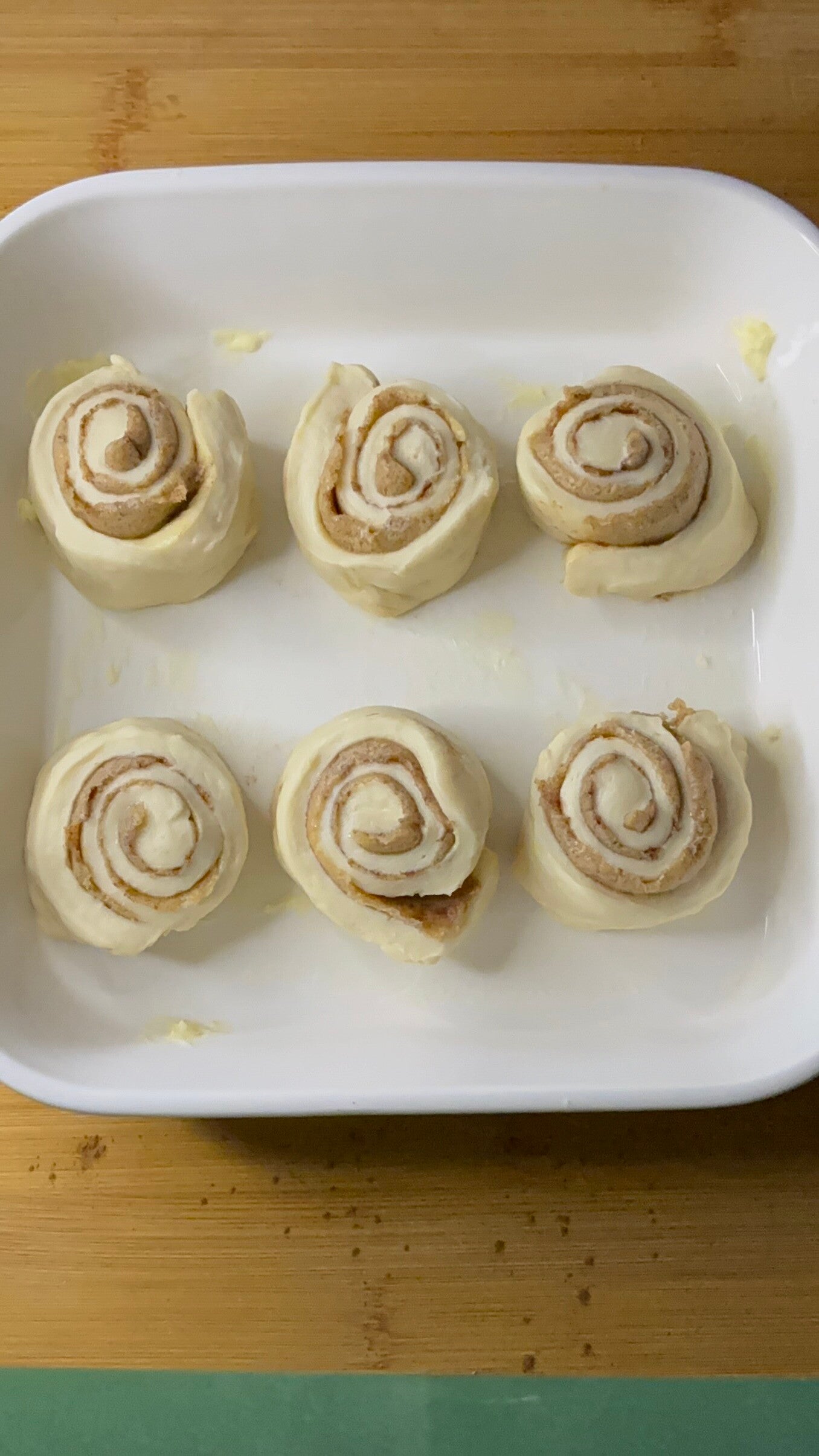 4. Passate le 2 ore prendete il vostro impasto, stendetelo con il mattarello formando un rettangolo. Cospargete l’intera superficie con la farcitura e arrotolate l’impasto fino ad ottenere un rotolino di pasta farcita. Con il filo interdentale tagliate delle girelle uguali e disponetele, in modo da non farle toccare l’una con l’altra, in una teglia imburrata. Coprite la teglia con la pellicola e aspettate che lievitino fino al raddoppio; circa per 90 minuti. Passati i 90 minuti, infornate a 190° per 20\25 minuti, forno statico.