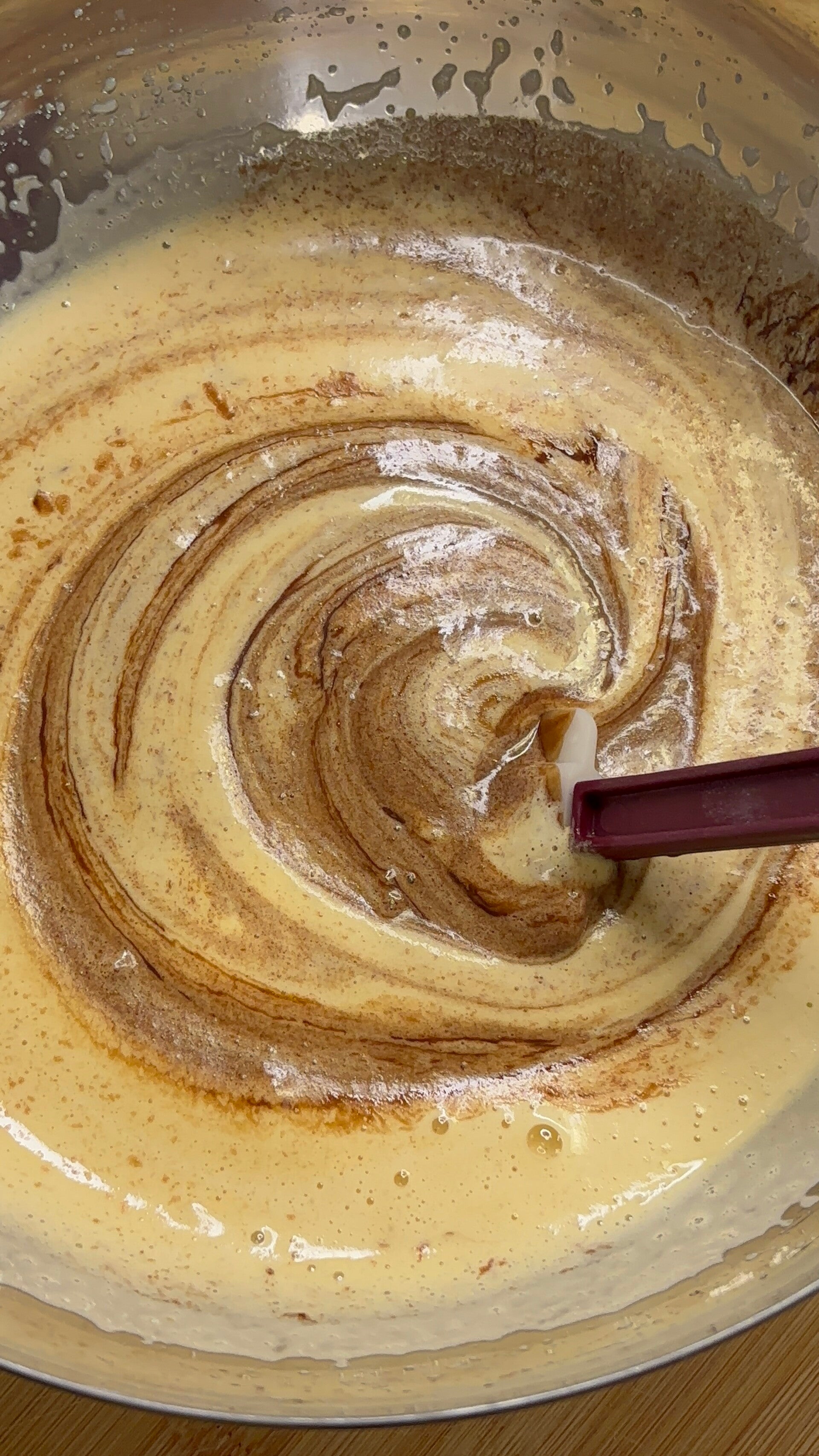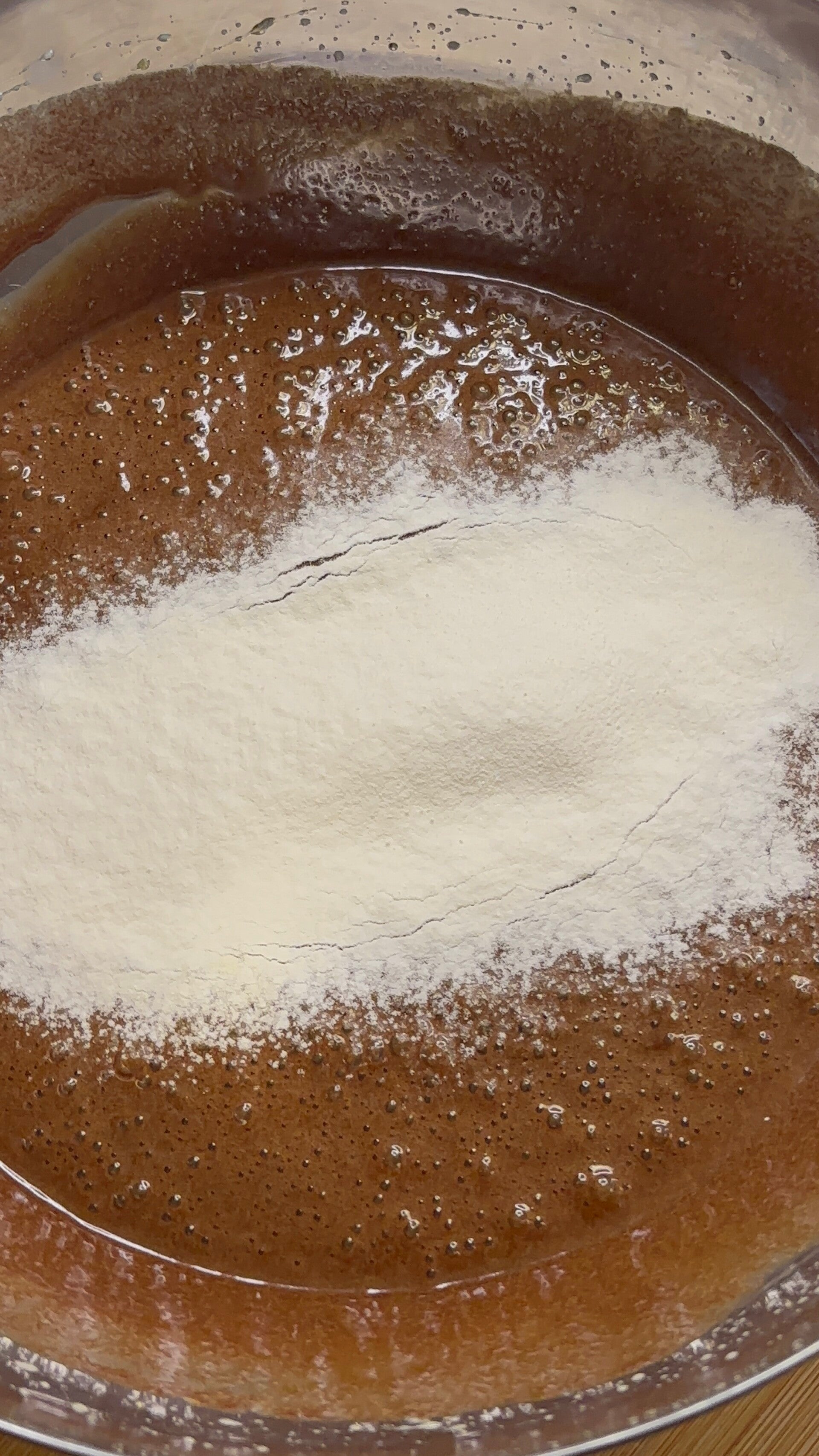 2. A parte, montiamo le uova con lo zucchero di canna e il sale. Quando saranno ben montati aggiungiamo il cioccolato fuso, mescoliamo il composto e per ultimo aggiungiamo la farina di riso setacciata e mescoliamo il composto.