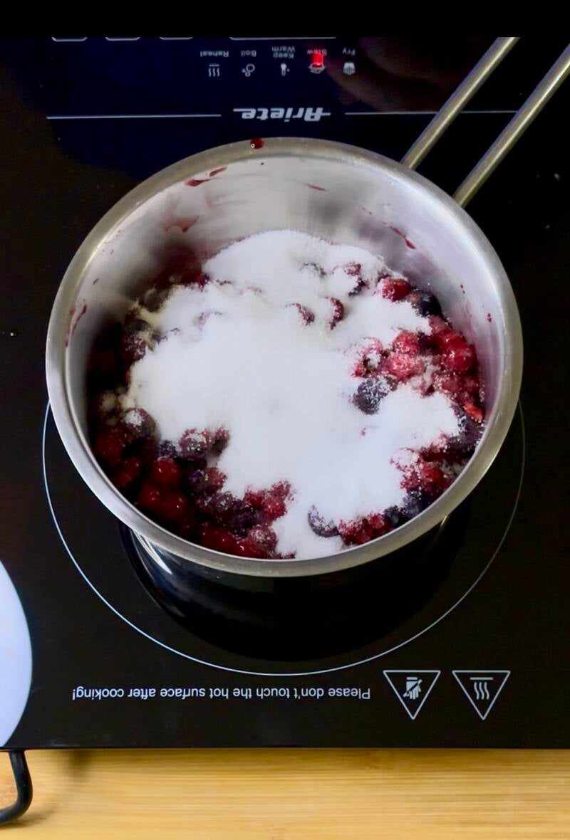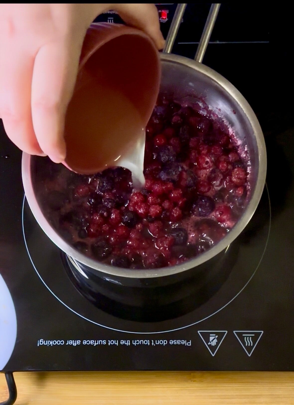 In un pentolino unite i frutti rossi con lo zucchero e il limone e fate cuocere per 15 minuti a fuoco medio, sempre mescolando il composto. Una volta che in superficie non ci sarà più schiuma e il composta risulterà liscio, è pronto; io ho deciso di frullarla una volta cotta per fare una decorazione con il biberon, voi potete anche metterla con un cucchiaio. Fate raffreddare la salsa almeno 1 ora prima di metterla sulla cheesecake.