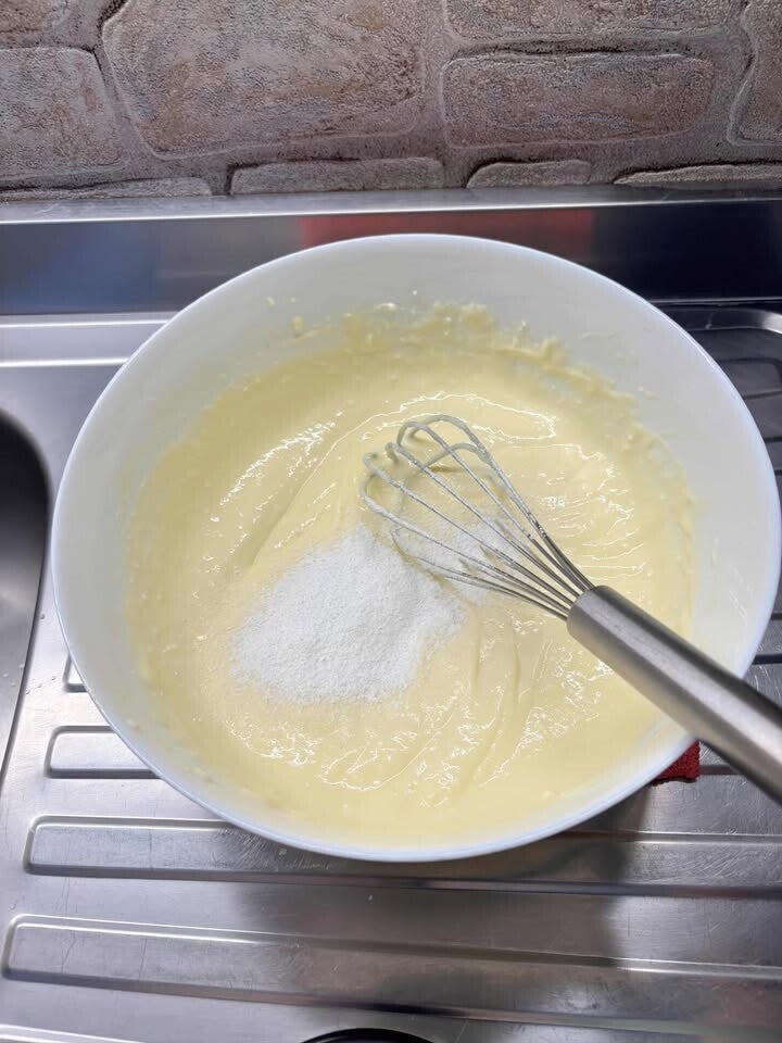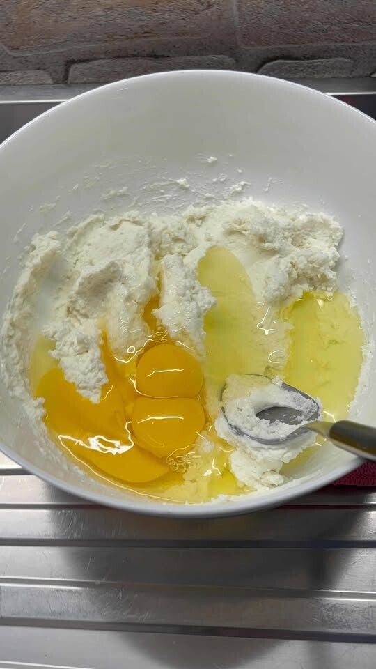 Iniziamo rompendo le uova in una ciotola e sbattendole con una frusta (va bene anche quella elettrica). Una volta che le uova sono ben mescolate, incorporiamo la ricotta. Quando la ricotta è completamente amalgamata alle uova, aggiungiamo la farina e il lievito.